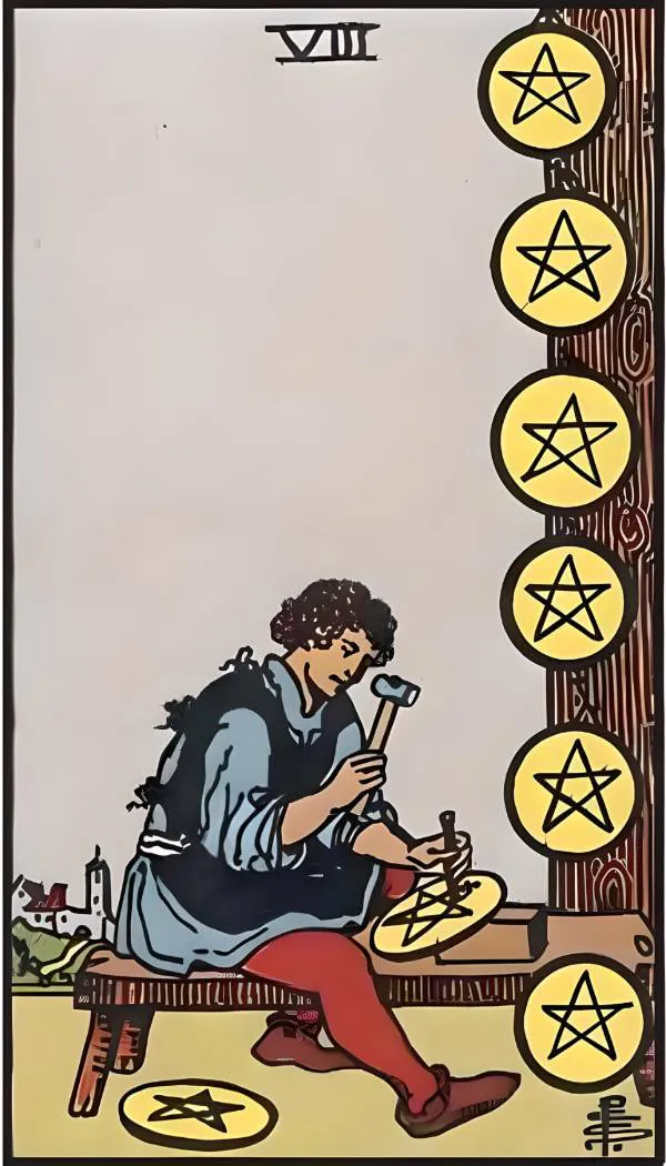 The Eight of Pentacles depicts a craftsman who has forged eight coins, with five of them hanging on a pole in a straight line, representing completed works.