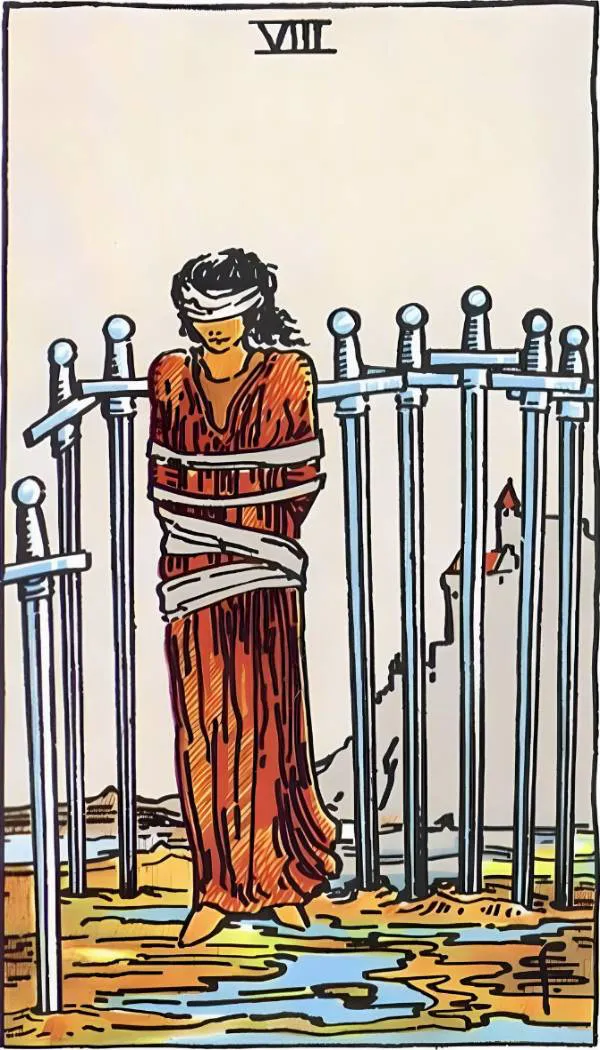 The image of the Eight of Swords is well-known, highly original in the Waite Tarot, and has almost become a classic image. It is also an important pictorial indicator in psychology and the arts and literature.