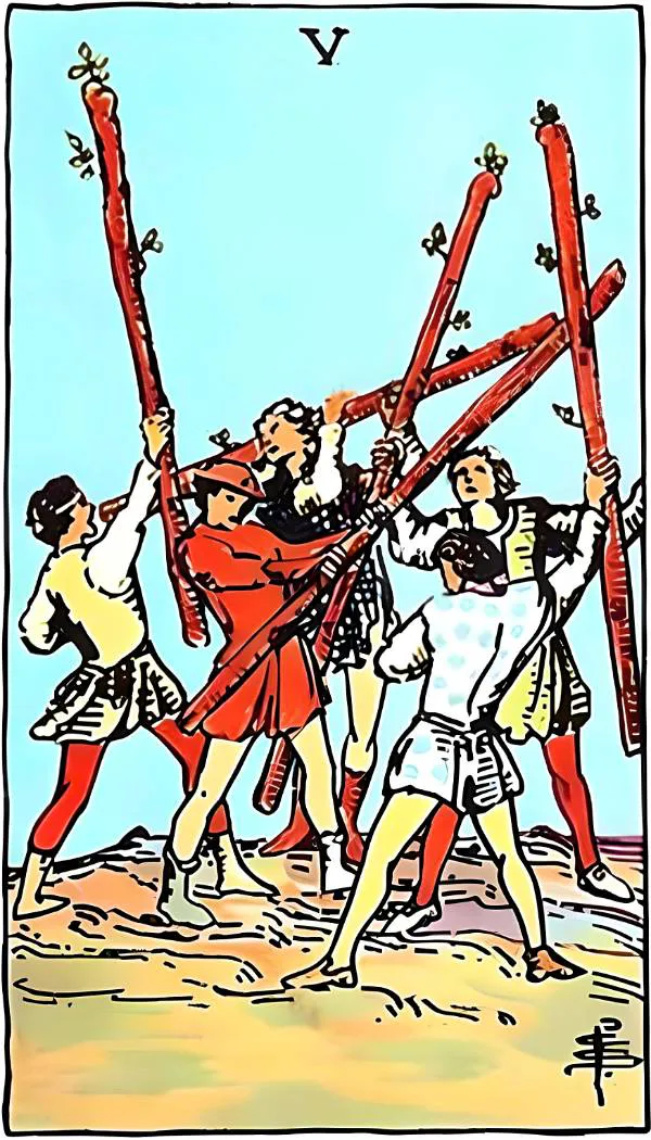 All five wands are off the ground, being brandished by different individuals with various stances and movements, filling the entire scene. The positioning of the wands in this card is the most disorderly, with people wildly swinging them, indicating struggle, competition, and conflict. The five individuals are entangled and grappling with each other, seemingly engaged in a fight or a sporting competition, and could also be interpreted as a mock battle. In this state of melee, no winner has been determined yet, and the chaos continues. However, it appears to be a genuine struggle with conflicting interests, not just playful fighting.