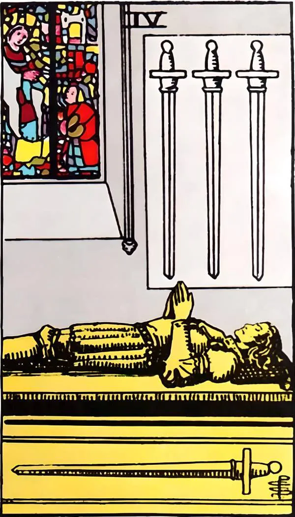There are four swords in the card. One sword under the reclining figure symbolizes the power of rational thought and mental clarity. The other three swords, usually depicted hanging on the wall or pointed downwards, signify the temporary pause of conflict and strife.