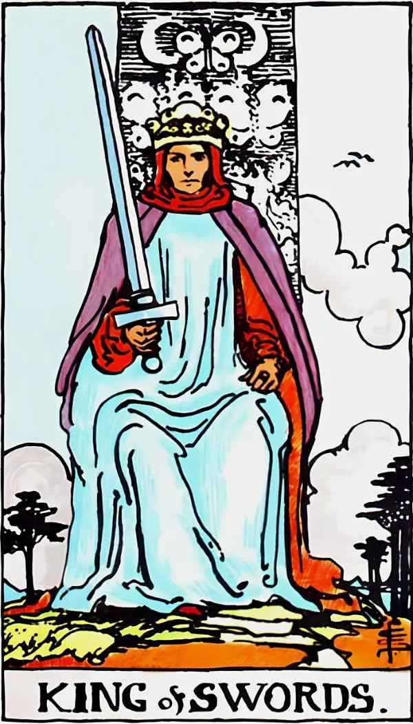 The King of Swords sits upright on his throne, his expression solemn and serious, his gaze deep and righteous. He faces directly forward, holding a long sword aloft with his right hand, as if looking through the sword. His facial features are rugged, giving an impression of severity and depth. The King of Swords embodies similar qualities to the Justice card's figure of justice, representing the virtues of the Justice card. However, as a sovereign, he seems to be announcing a verdict and is about to exercise his ultimate power over life and death.