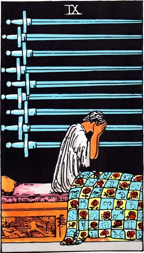 The nine swords that hang above the figure represent the weight of mental anguish, fears, and worries. These are the tormenting thoughts that keep one awake at night, contributing to a sense of dread and hopelessness.