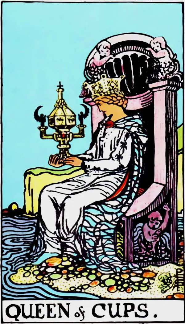 The cherubs depicted on the throne of the Queen of Cups symbolize innocence, pure-heartedness, and divine love. Their presence indicates that the Queen’s emotional wisdom and intuitive abilities are deeply connected to higher spiritual truths. Cherubs, as divine messengers, also underscore her role as a conduit between the conscious and unconscious realms, reflecting her ability to tap into the collective unconscious and divine love.