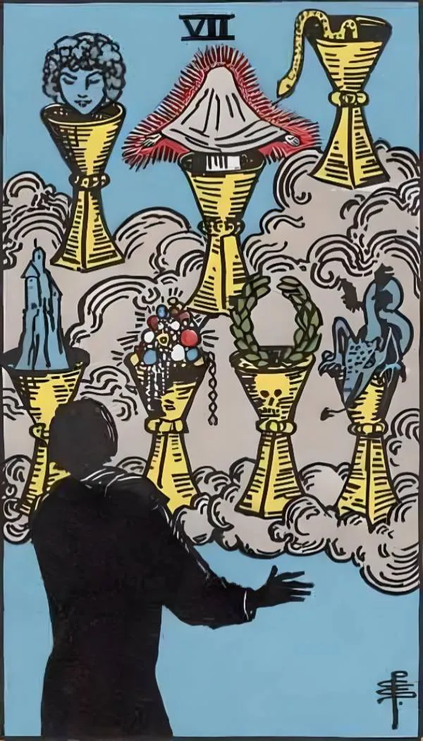 These cups, floating amid the clouds, represent the multitude of choices or desires available. Each cup holds a different vision, highlighting the overwhelming emotions and confusion one might feel when faced with numerous tantalizing options or illusions.