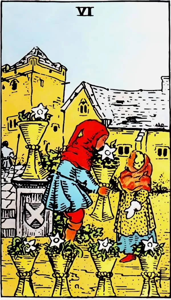 Observe the loving way the boy offers the flowers to the girl. The Six of Cups can also represent care and giving, or receiving an inheritance. You may receive special attention from someone, as if they have placed you in this safe manor. It may also represent giving or receiving gifts. More broadly, providing experience and education is also a form of giving. The happiness of the Six of Cups is simple, as innocent as childhood, sometimes just a cup of coffee made by a good friend can bring immense joy.