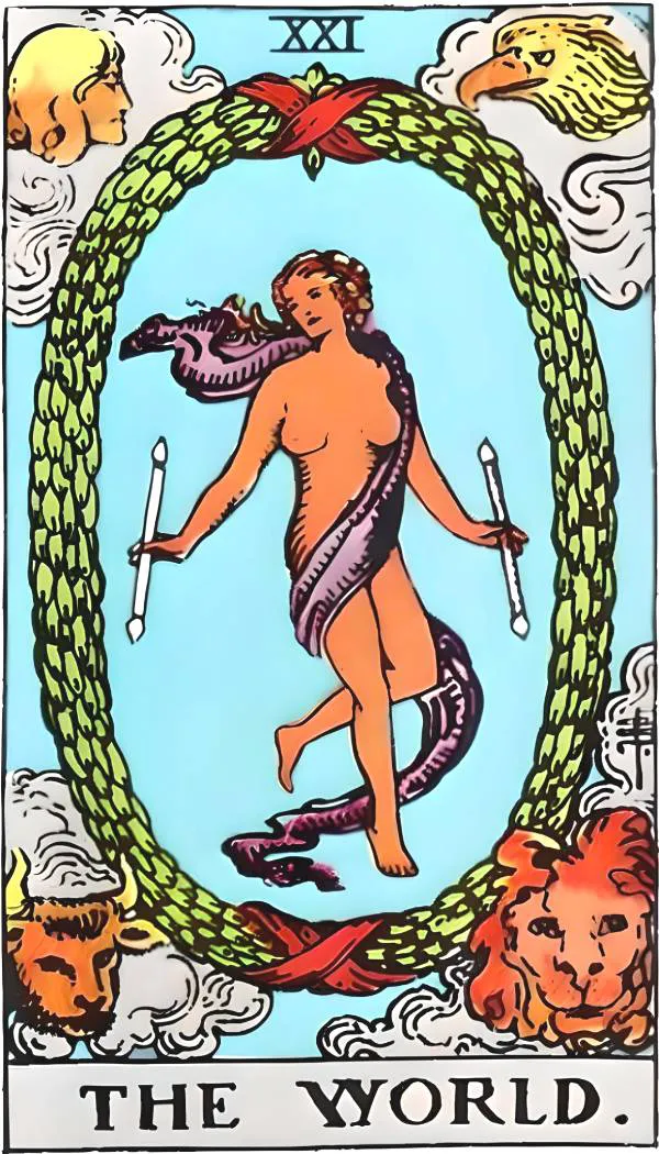 The design of the World card has many elements to echo, connect, and integrate with each of the previous cards. As the last major secret, the content theme is related to "the end", which cannot be ignored. It must show the best and the end of the cosmic system, and depict a deeper feeling, and the secret is hidden in it, the cosmic ecstasy is when it understands itself in God.