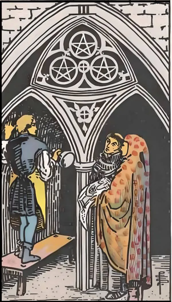 The central scene of this card depicts a typical medieval church architecture, viewed from the outside looking in. Three Pentacles are embedded at the top of the archway, though they do not show their golden color, as the entire scene is focused on the renovation of the building.